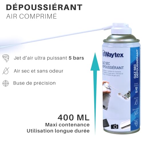 Lot de 4 Bombes Dépoussiérantes Air sec 400 ml Waytex Aérosol air comprimé Ultra Puissant 5 bars Nettoyant Informatique