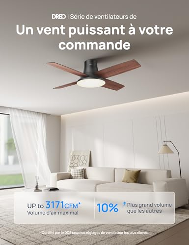 DREO ventilateur de plafond silencieux avec lumière LED, 112cm, réversible, 5CCT, 6 vitesses, facile à installer, minuterie, montage en surface, télécommande, noir